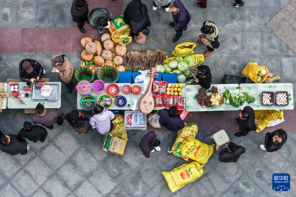 集市上,来自乡村的优质土特产集中亮相,吸引众多居民前来品尝、选购。