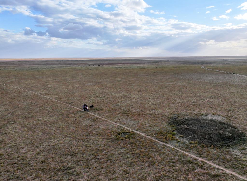 2025年9月23日,达来骑摩托车行驶在自家草场上(无人机照片)。新华社记者 连振 摄