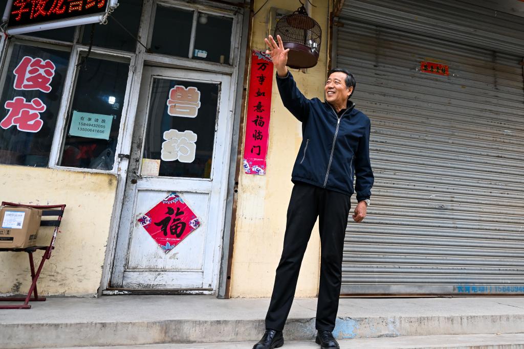 2025年9月22日,孙保卫在自己经营的兽药店门口向朋友挥手致意。