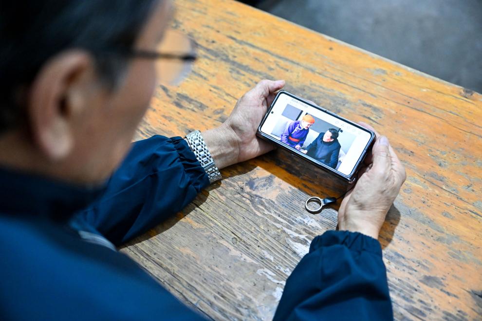 2025年9月22日,孙保卫在自己经营的兽药店内查看他与“草原母亲”都贵玛的合影。