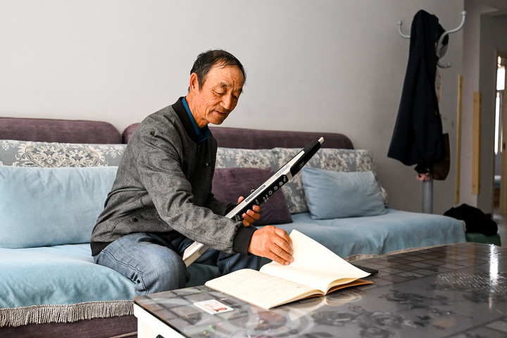 2025年9月25日,其木德在家中翻看自己谱写的乐谱。新华社记者 连振 摄