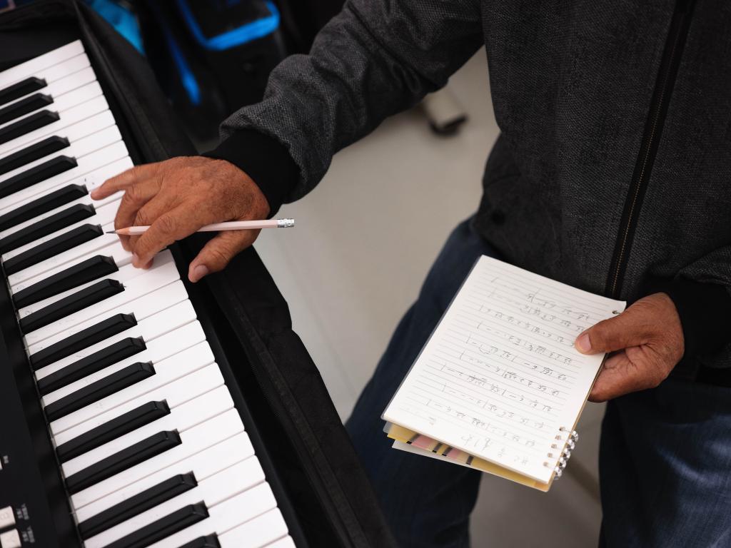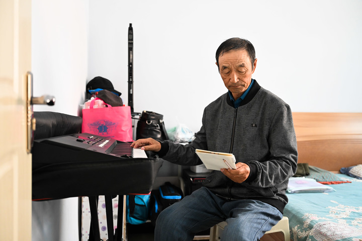 2025年9月25日,其木德在家中翻看自己谱写的乐谱。