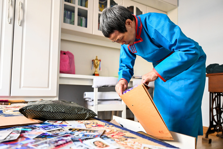 2025年9月25日,额日其照日嘎翻阅家庭老照片。