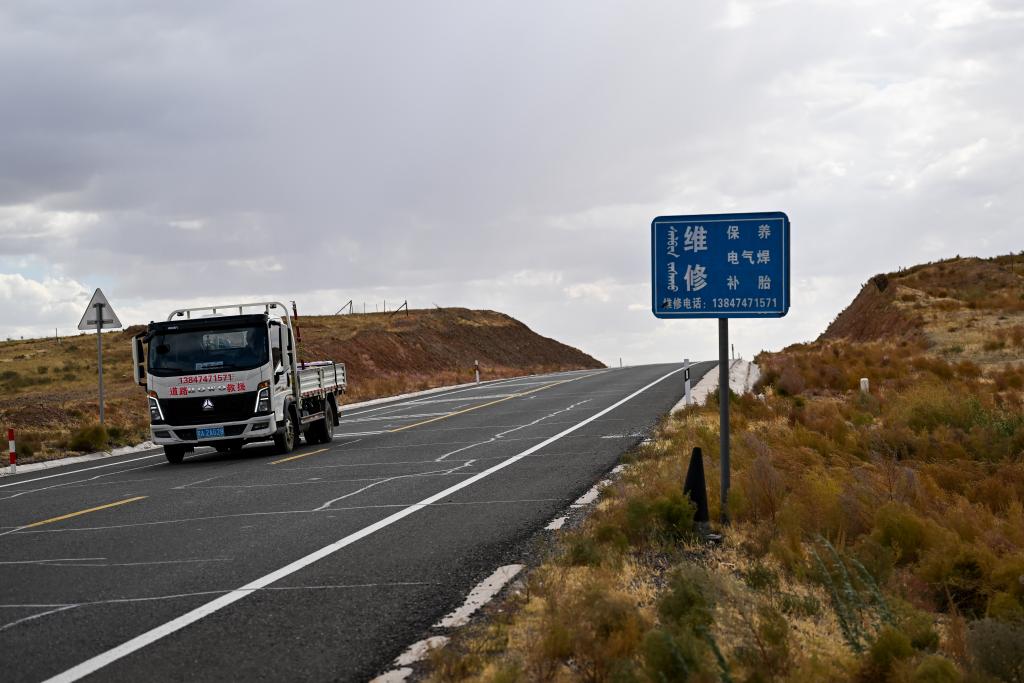 2025年9月23日,钢宝力达驾驶救援车行驶在边境公路上,路边设置有标明他联系电话的指示牌。