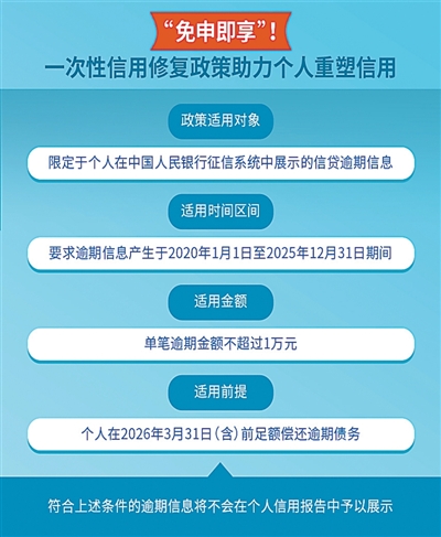 政策细节传递金融温度。先看政策适用条件,逾期信息只有产生于2020年1月1日至2025年12月31日期间才能适用,意味着受疫情等因素影响违约的非恶意失信者,只要是小额逾期、并在规定时间内偿还,就能“抹平”不良记录,获得一次信用重启的机会。