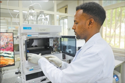在埃塞俄比亚农业部下属的动物产品和投入品质量检测中心,质量分析师法努埃尔正在进行样本检测。