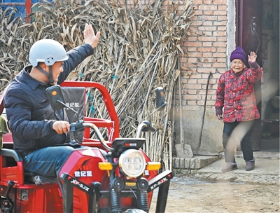 盛好午饭的老人在家门口与庞富强挥手道别。