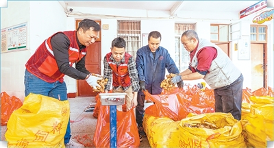 广西梧州蒙山县长坪瑶族乡长坪村驻村工作队队员与农户一起分装生姜。