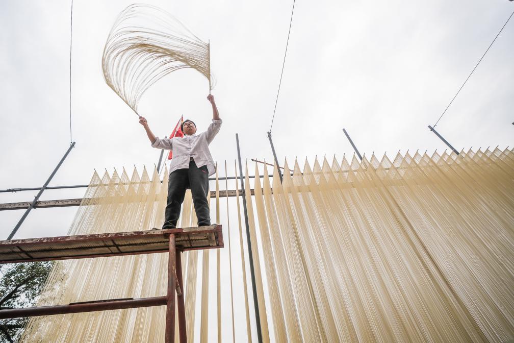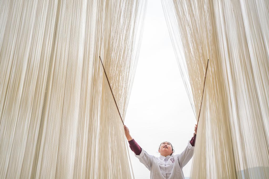 2月22日,在四川省德阳市中江县觉慧村,村民在晾晒手工面条。
