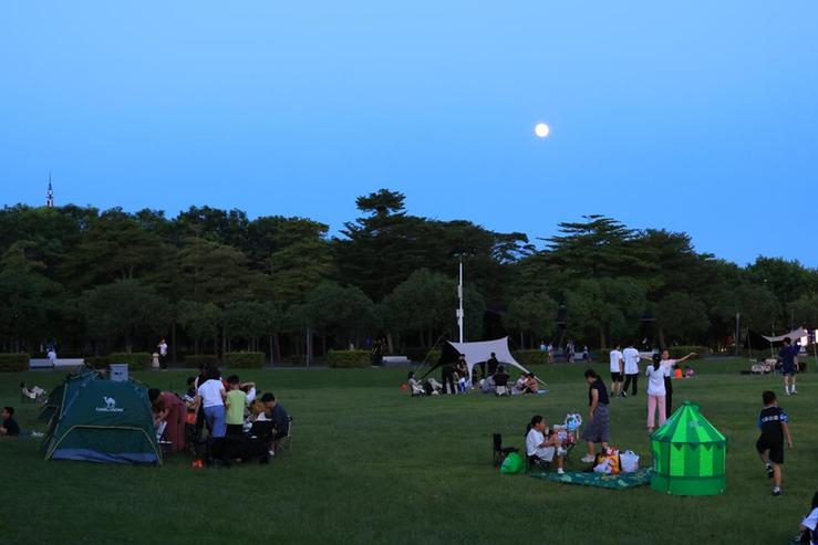游客在深圳湾公园露营赏月。新华社记者 毛思倩 摄