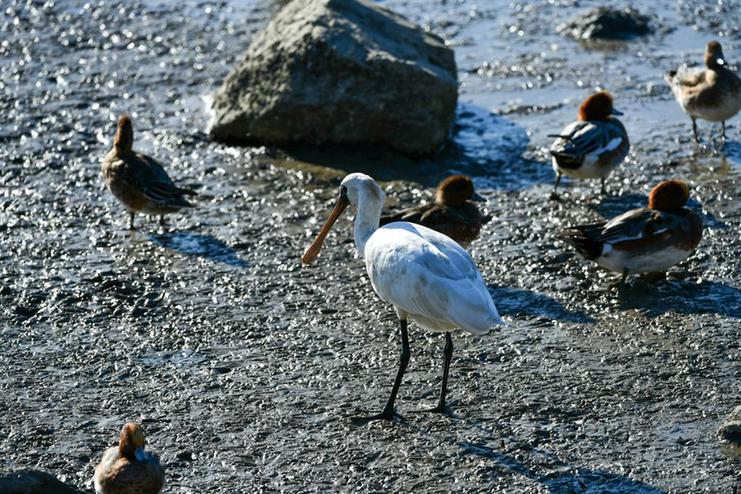 在深圳红树林海滨生态公园,黑脸琵鹭等候鸟在觅食休息。新华社记者梁旭 摄