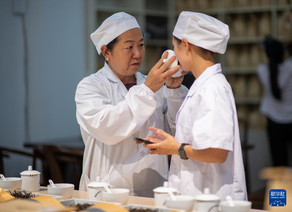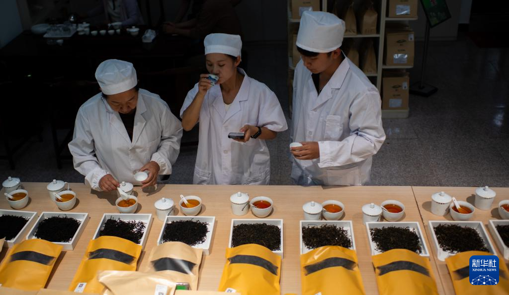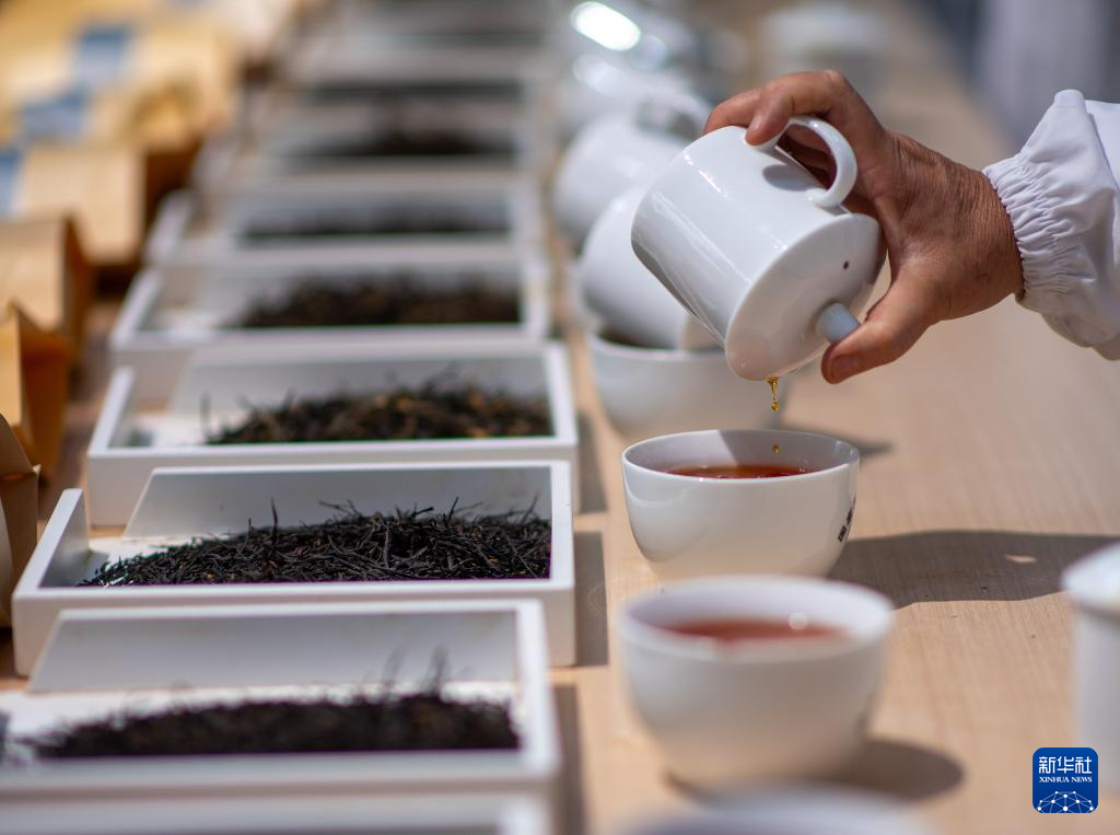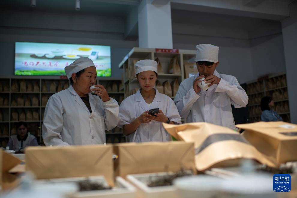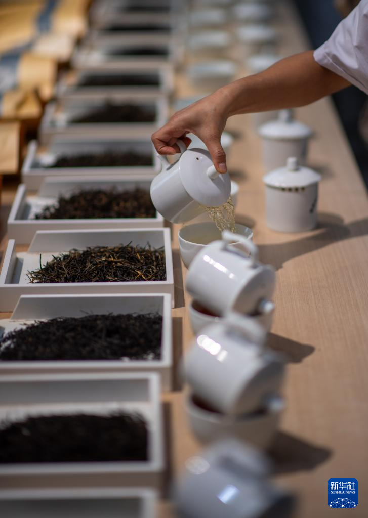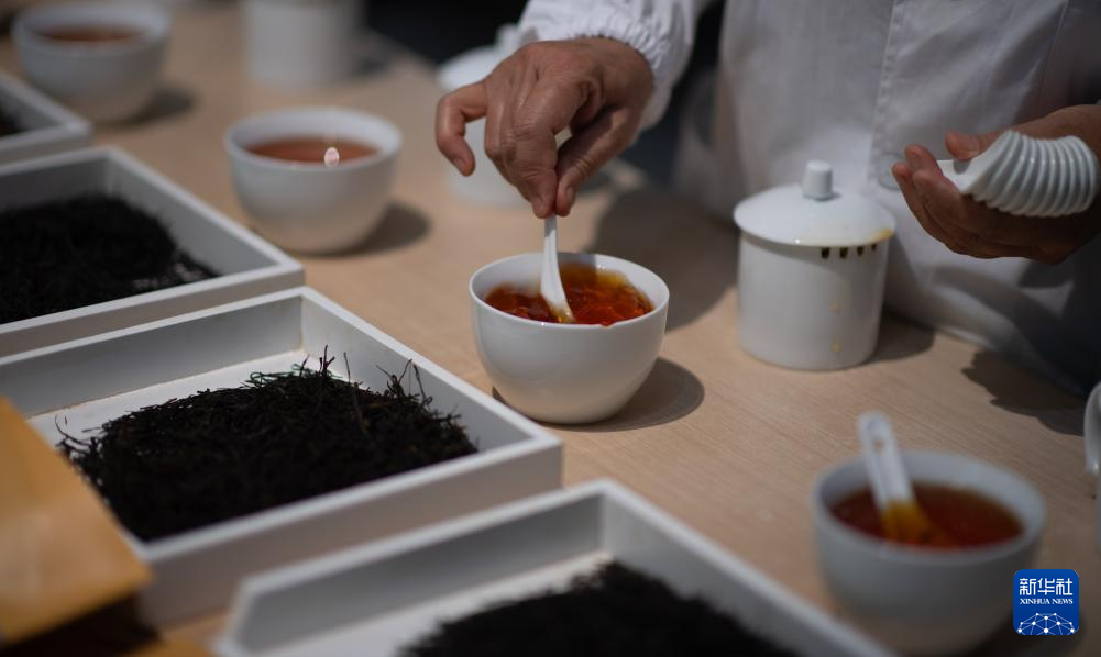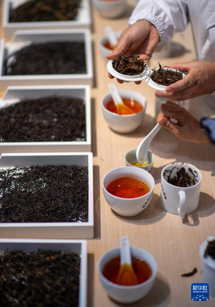 4月22日,云南省临沧市双江县茶叶检测品荐溯源中心的专家在评审茶叶。