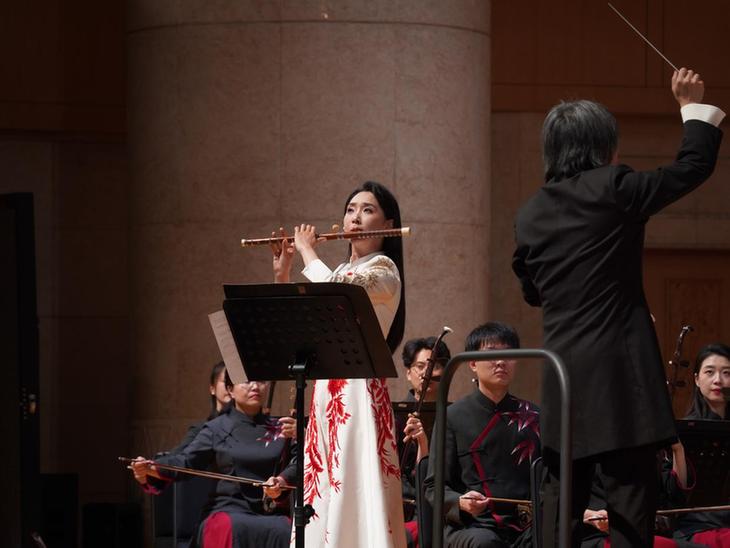 北京民族乐团供图从公园的树荫下到剧场舞台,孙楚泊换了一身气度。演出当晚,舞台上的孙楚泊,与公园里那个亲切的、偶尔还有点小迷糊的邻家女孩截然不同。她带来竹笛与乐队《红高粱叙事曲》庄重而沉稳。在指挥的带领下,她将自己的笛声融入乐队之中,与乐手们共同完成了一道艺术的盛宴。